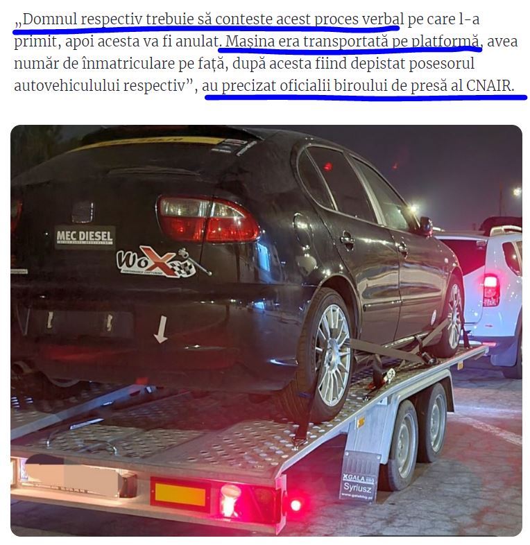 Am citit articolul, stai linistit, dar in foto facut la un auto pe platforma, oare nu apare platforma, vehiculul care tracteaza ? Asta am intrebat. Cu ce dovezi isi sustine povestea? De ce sa-l cred pe el sincer, si pe cei de CNAIR tampiti? Poate omul a gasit o portita sa nu achite amenda, iar ziarul vrea sa fie senzational! Si nu vad de ce o masina de competitie trebuie sa mearga cu numere. Cei care participa la competiile de drifturi n-au numere pe masini...